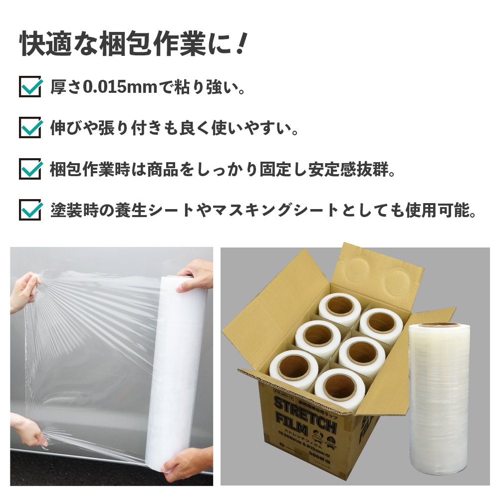 商品の梱包や荷崩れ防止、輸送時の荷物の破損などを防ぐのに便利なストレッチフィルムです。