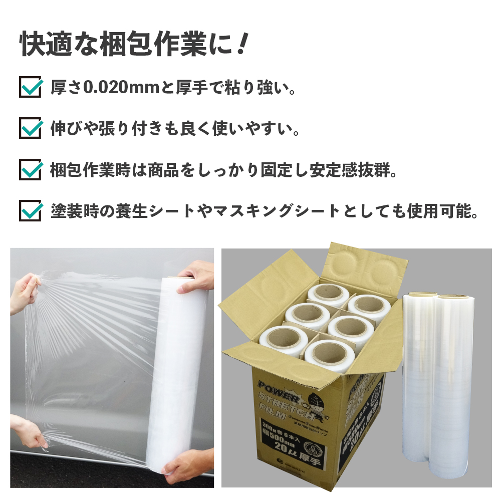 商品の梱包や荷崩れ防止、輸送時の荷物の破損などを防ぐのに便利なストレッチフィルムです。