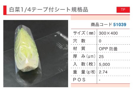 【商品特徴】白菜1/4カット用POSシート、片側TP付で作業性UP